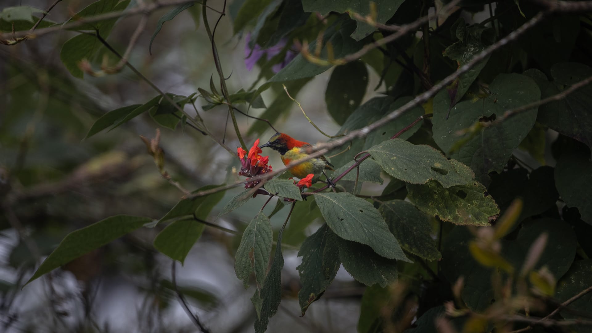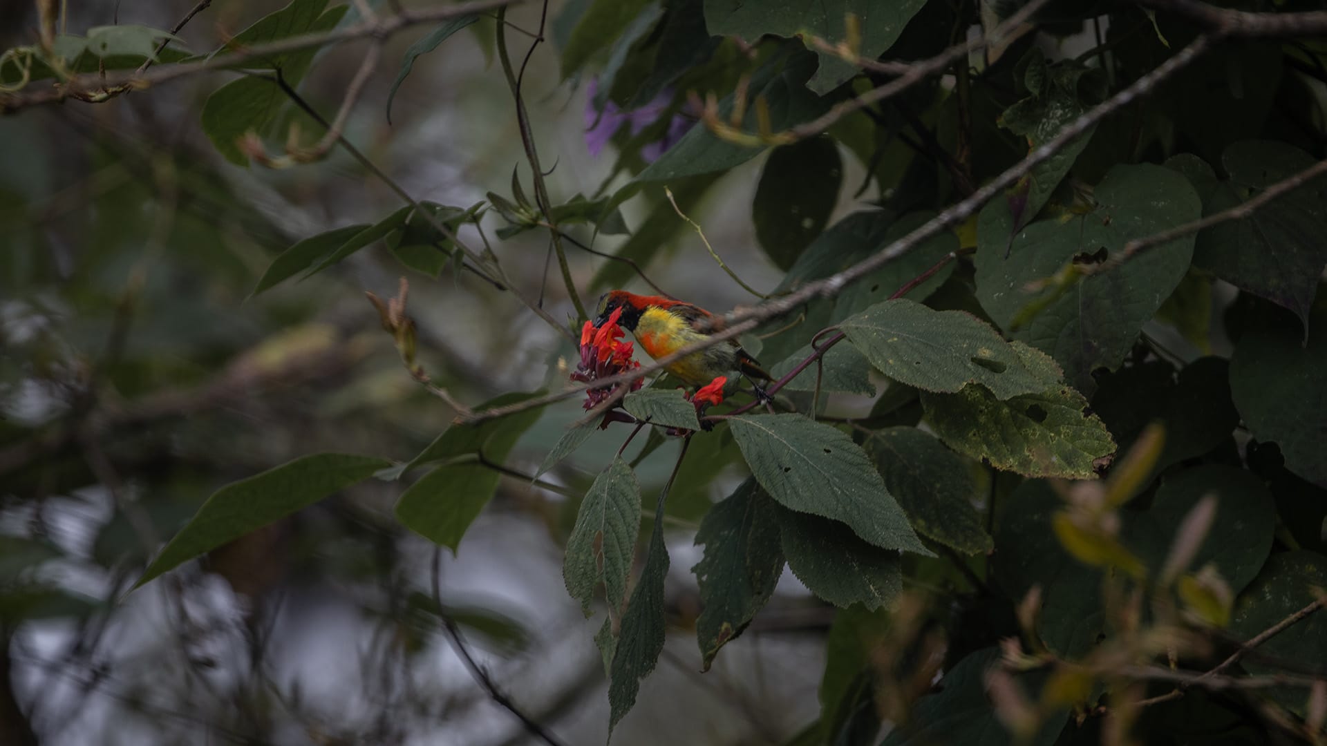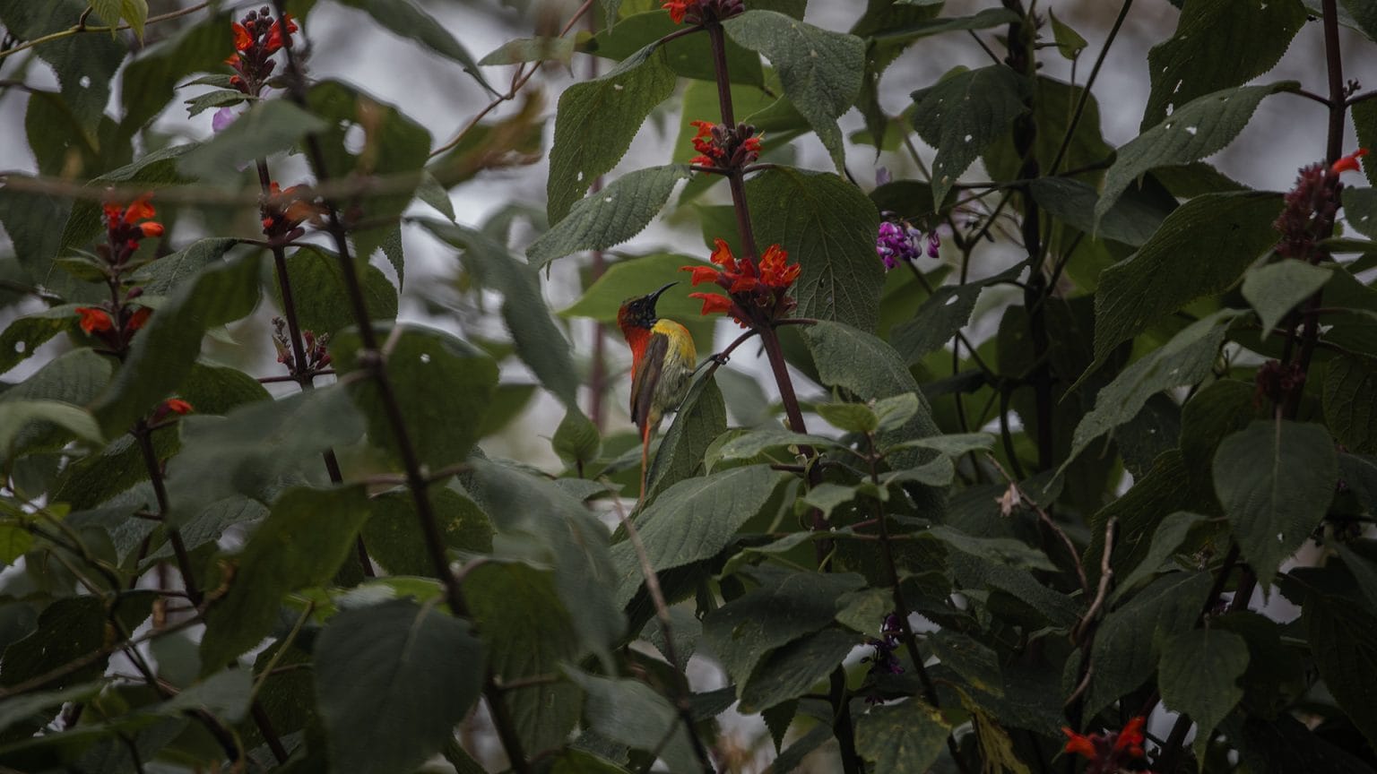 A Fire-tailed Sunbird feeding in the mountain forest — small, fast, and beautifully colored. These shots were taken during a brief, quiet sighting.