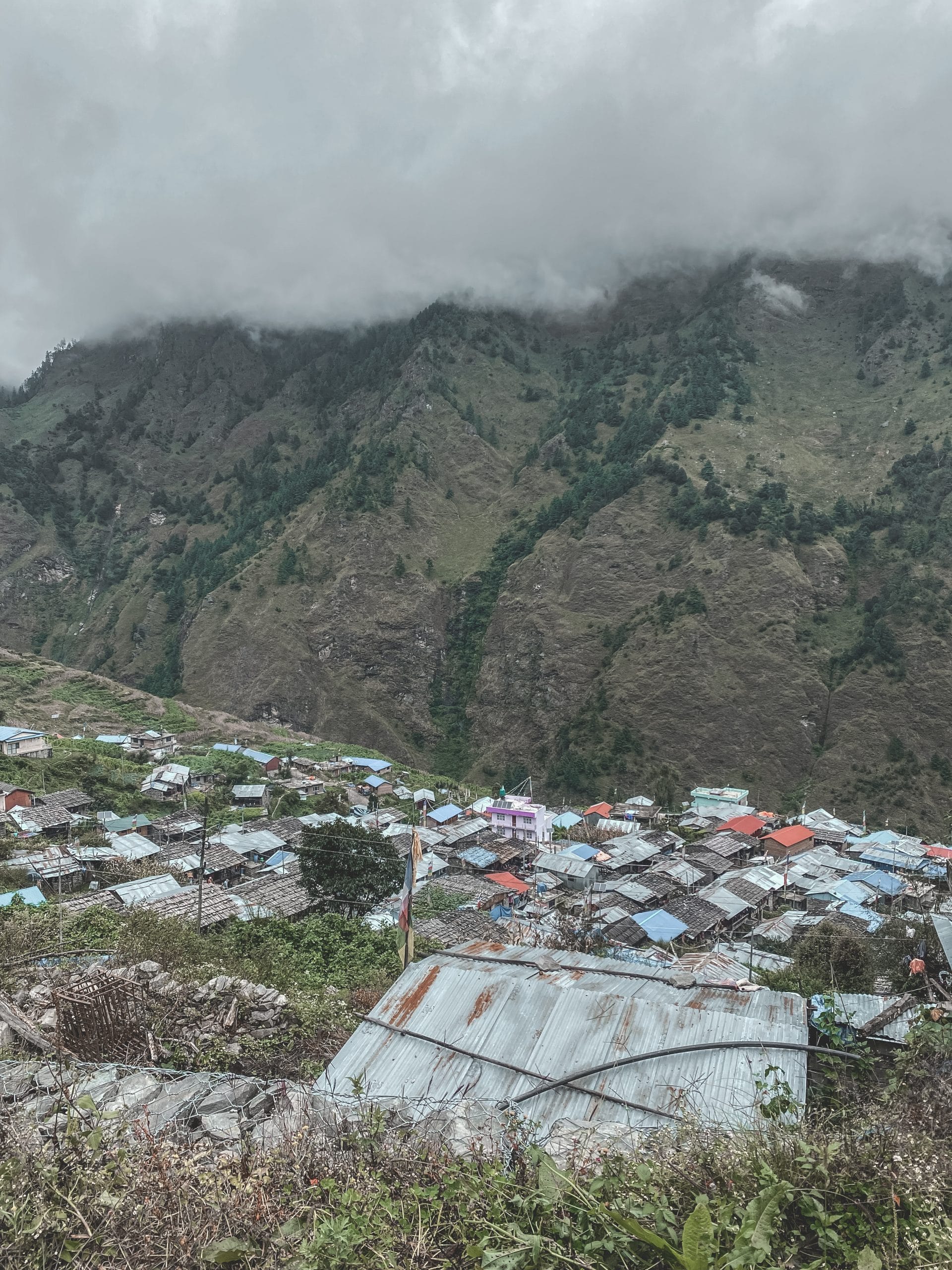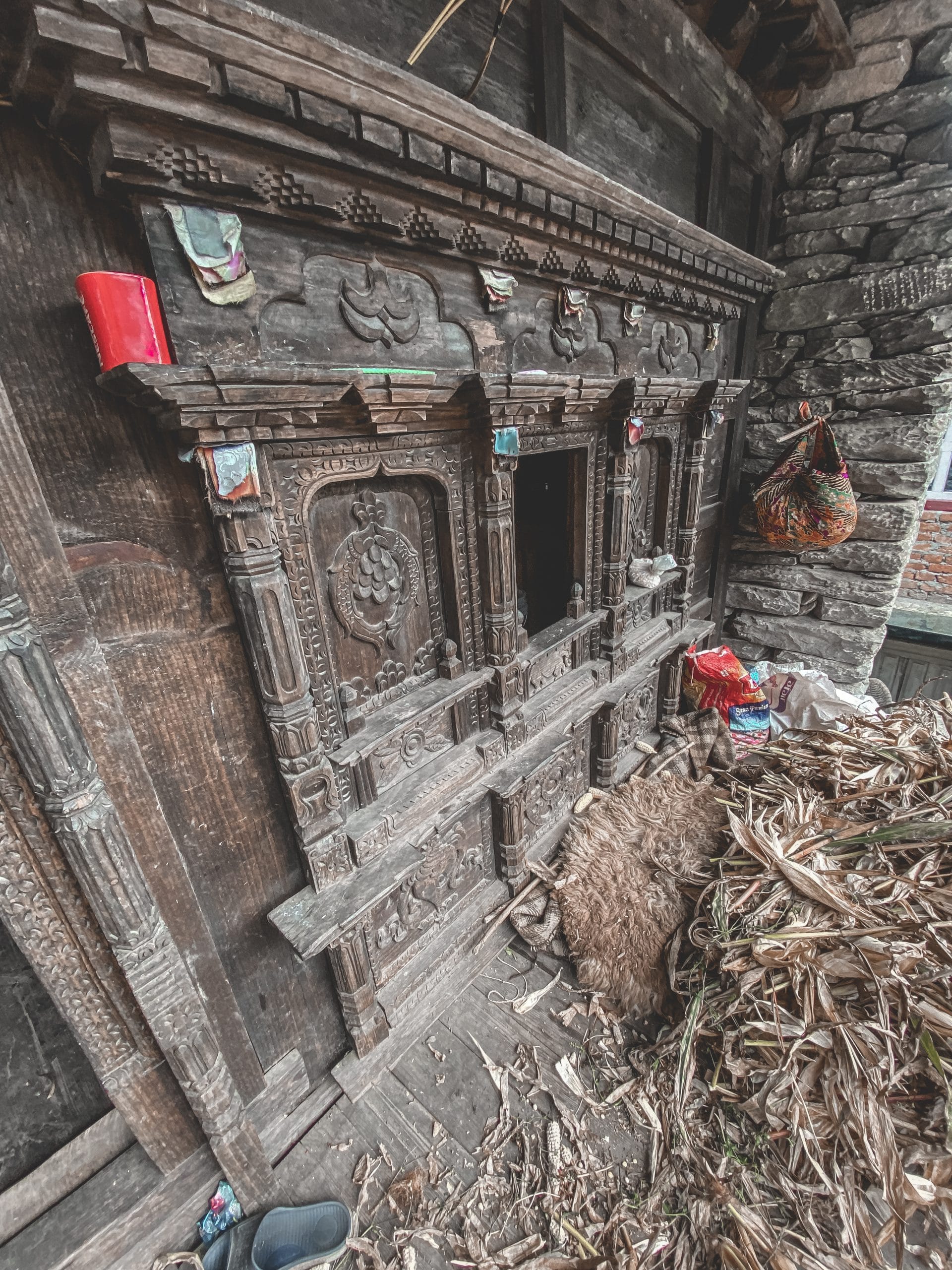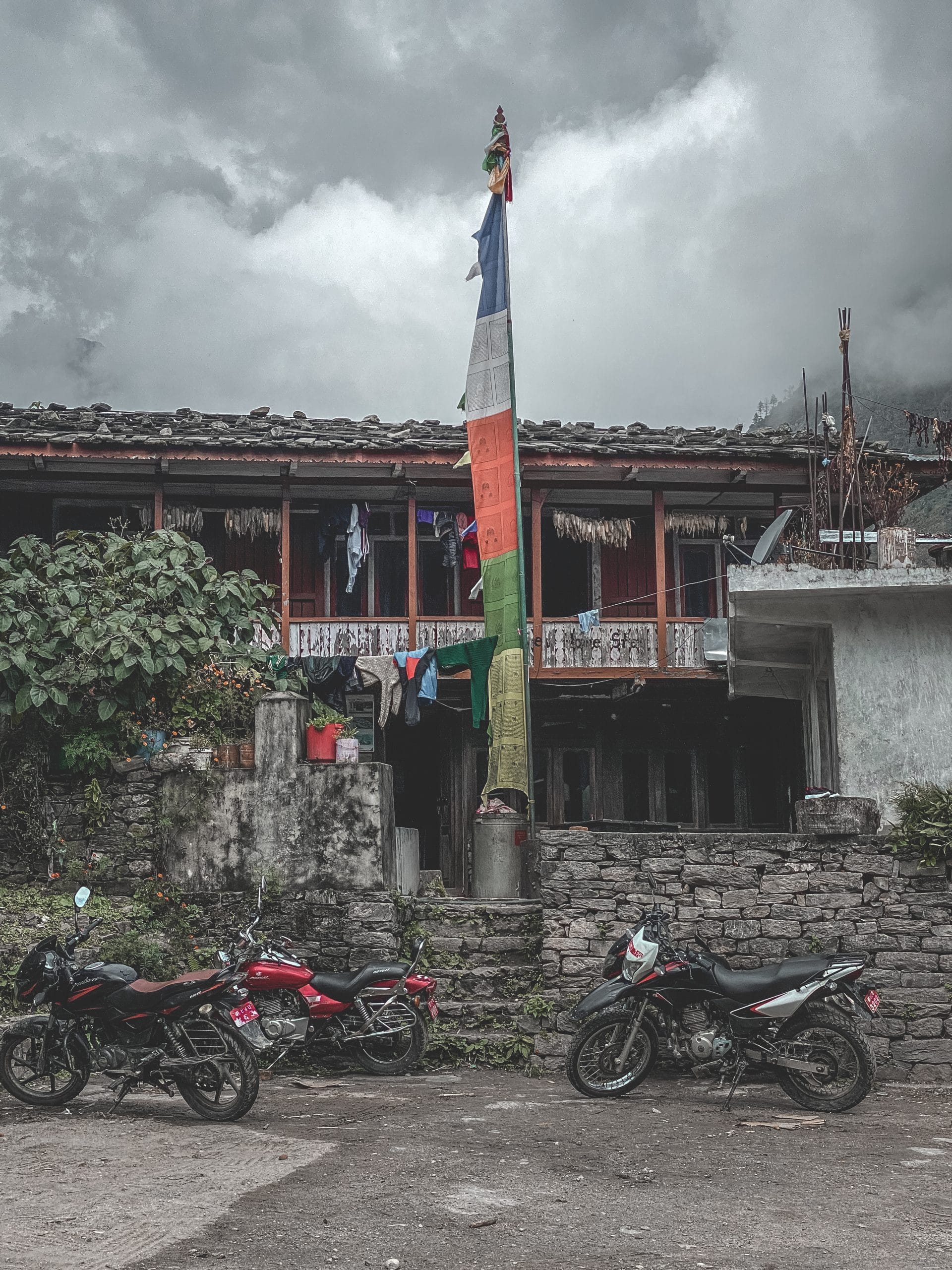 Gatlang finally appears: a dense cluster of dark-roofed, slate-and-wood Tamang houses layered perfectly into the hillside. The village was once called the “Black Village” because the sun-darkened wooden walls and smoke-aged roofs gave it a deep, earthy tone. Up close, the details reveal themselves — carved windows, stacked stones, prayer flags swaying in the wind, and alleys polished smooth by generations.