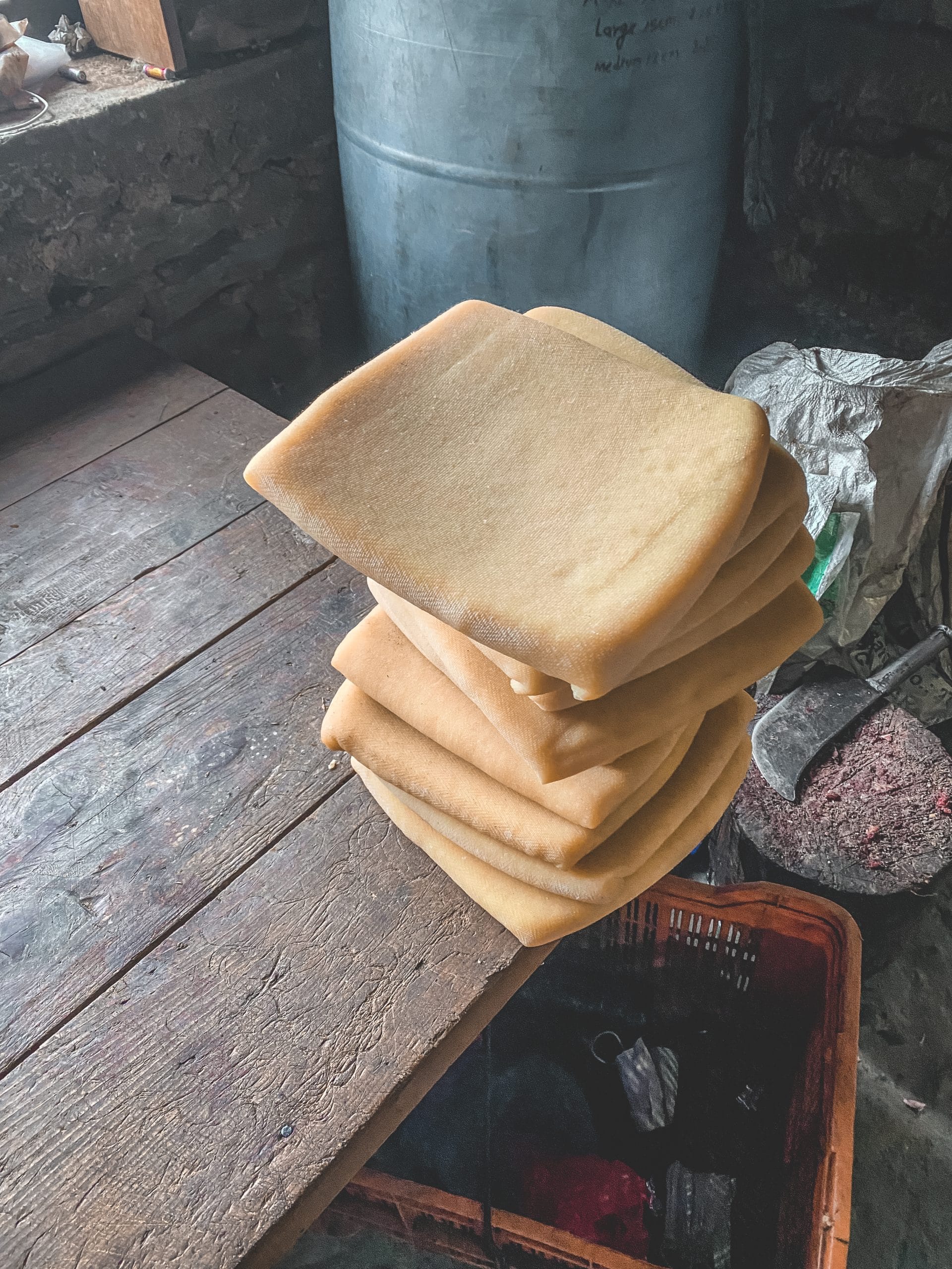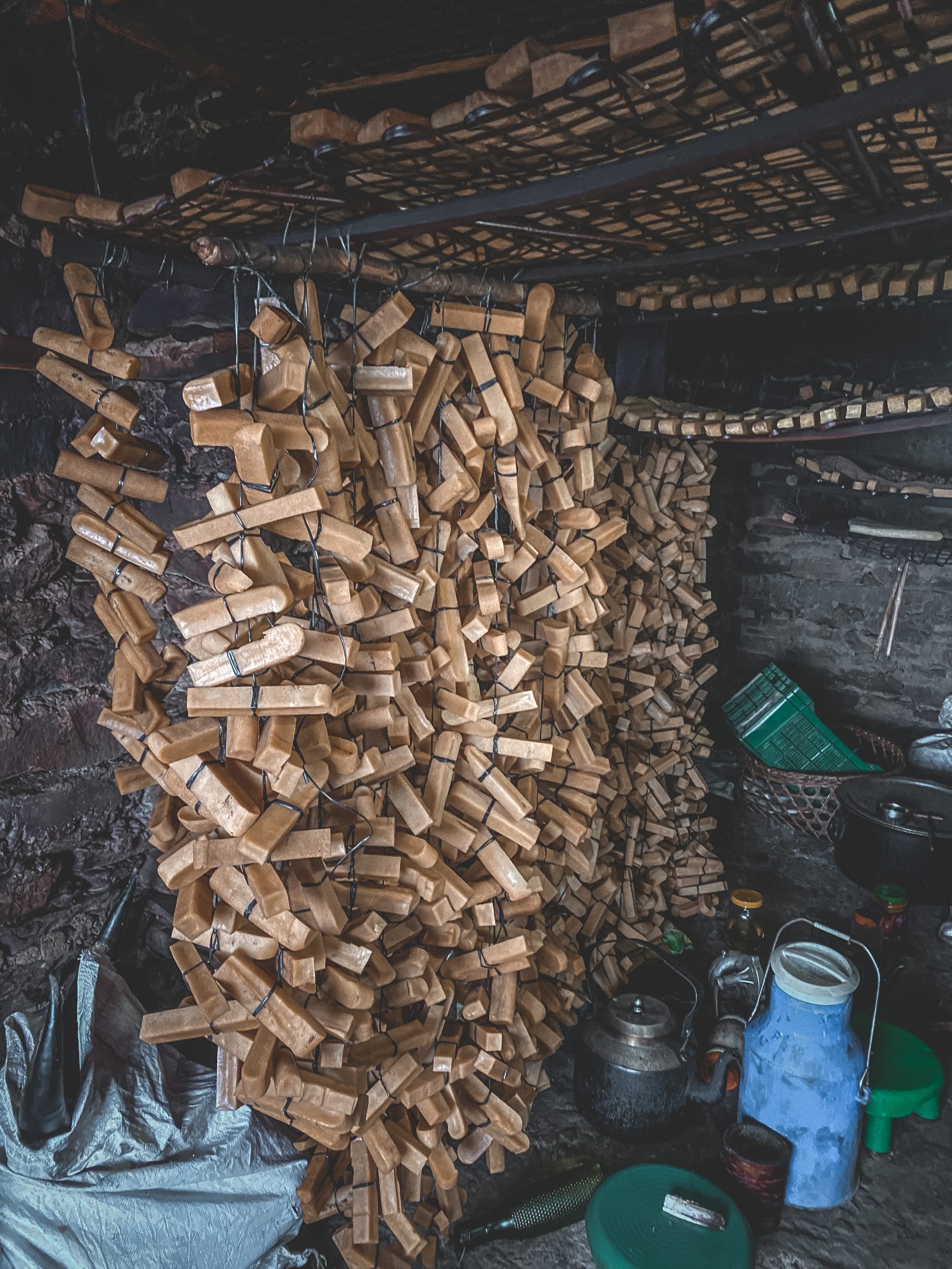 Back in the village, tasting churpi and yak cheese becomes its own experience. Inside dark, cool rooms, cheese wheels age slowly while churpi dries in long strings. The first bite is tough, then softens, releasing flavors shaped by grass, smoke, and mountain air. These aren’t just snacks; they’re edible memories of Gatlang’s landscape and way of life.