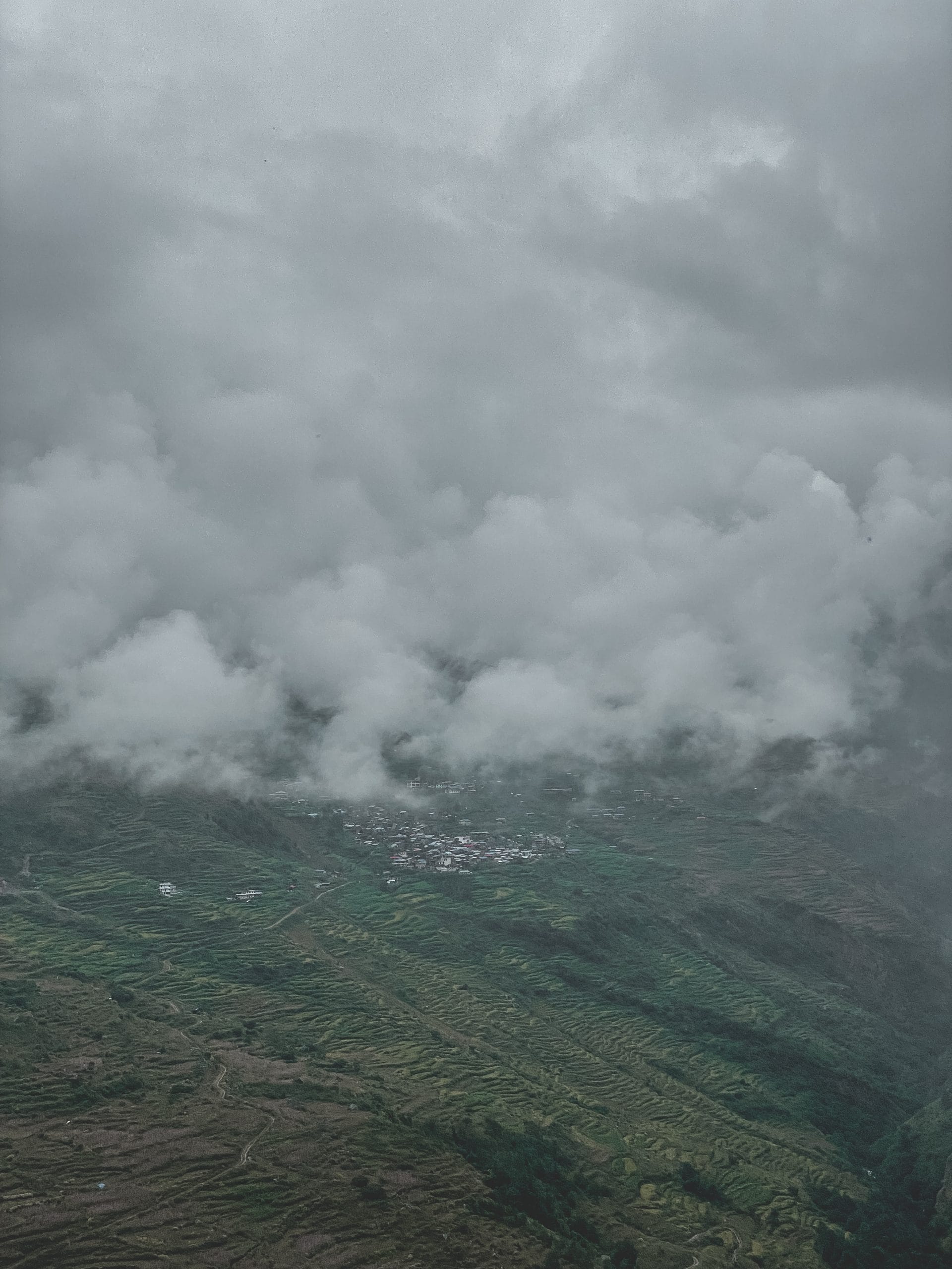 Halfway up, the valley opens like a slow-motion panorama. Terraced farms form gentle curves on the hillsides. Distant ridges fade into blue haze. Rivers glitter far below. The horizon stretches endlessly, and the higher you ascend, the clearer the mountains breathe around you. This is the point where you finally understand why people travel hours just for this sight alone.