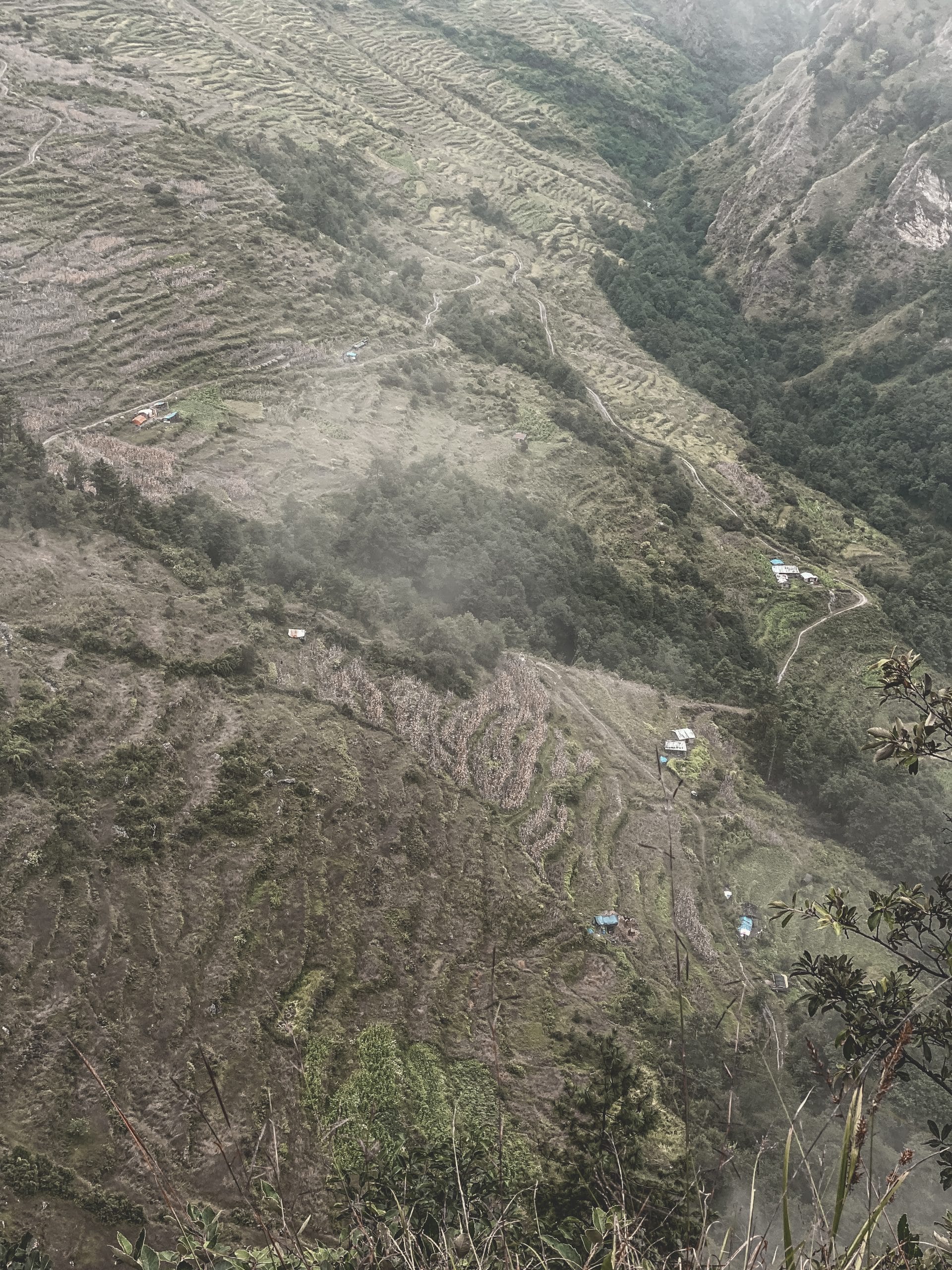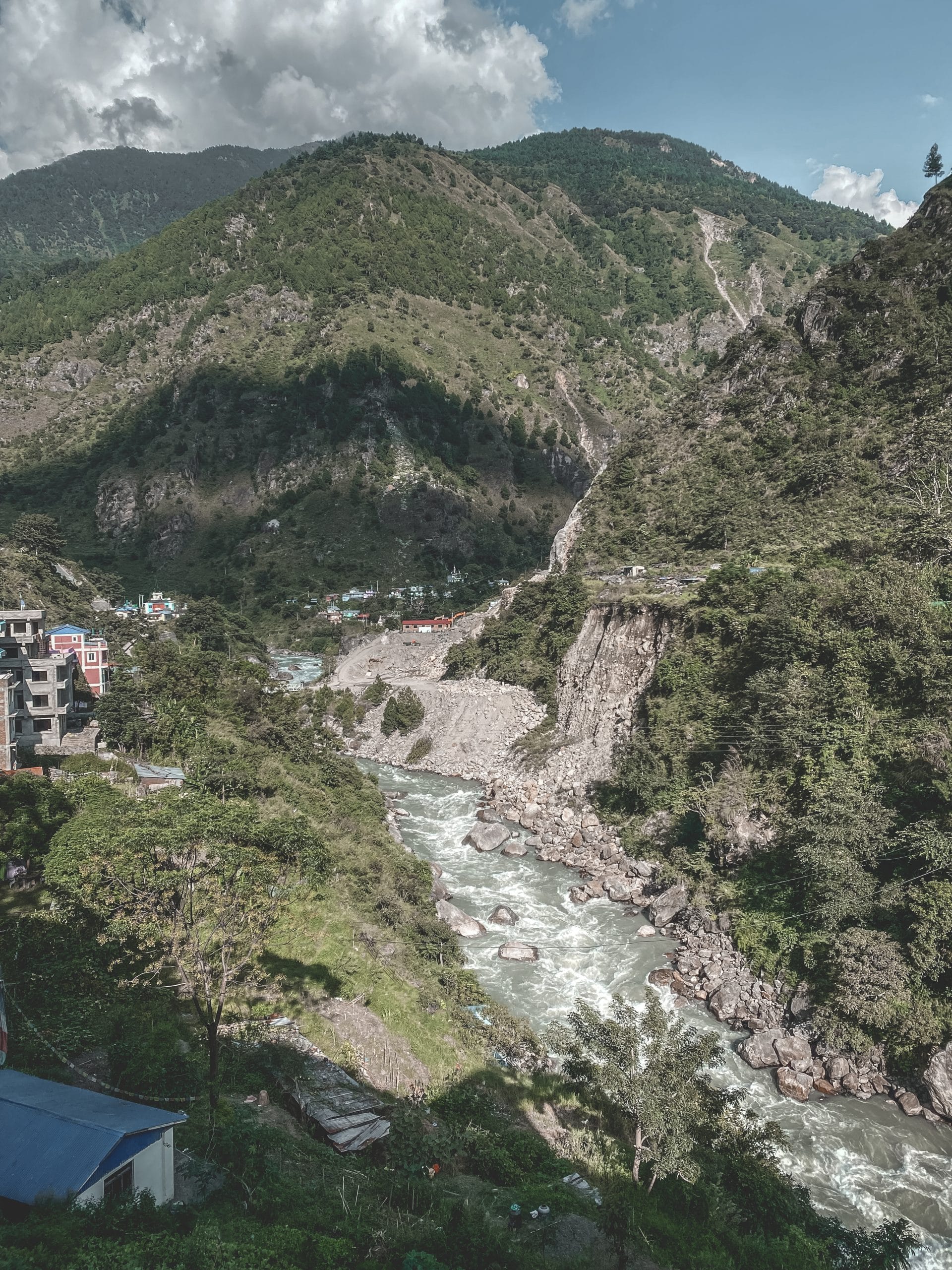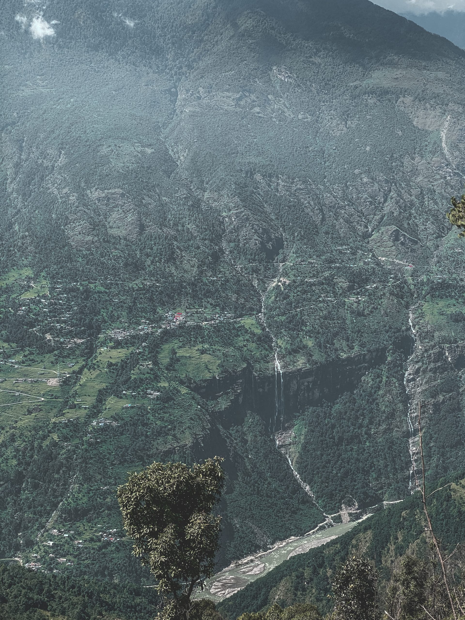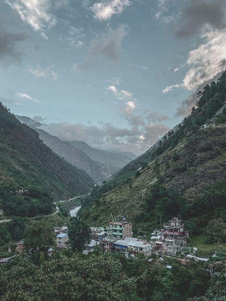 Before entering the heart of Rasuwa, the scenery softens into layers of blue-grey hills stacked under a fading sky. The rivers below catch the last light, turning gold before dissolving into dusk. These fleeting views — seen through gaps in trees and bends in the road — feel like quiet promises of what’s ahead. A landscape half-hidden but full of depth.